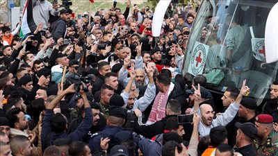 استقبل آلآف الفلسطينيين في قطاع غزة الأسرى المحررين من سجون الاحتلال، بعد وصول الحافلات التي تقلهم إلى ساحة المستشفى الأوروبي جنوبي قطاع غزة.