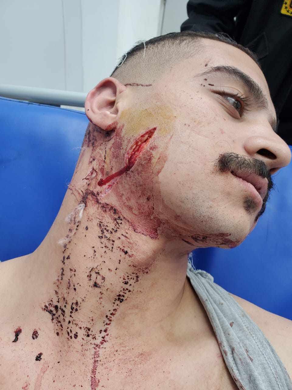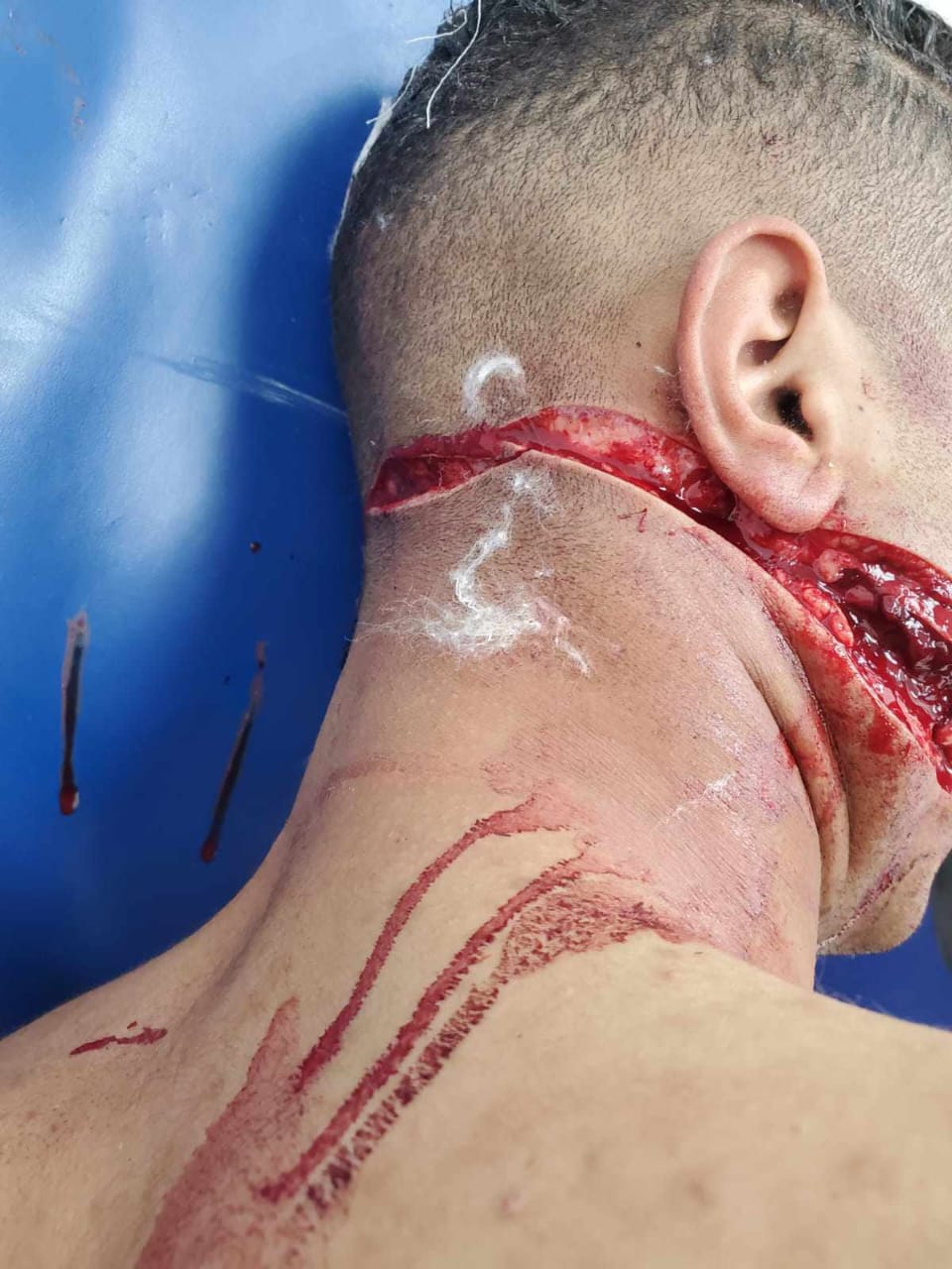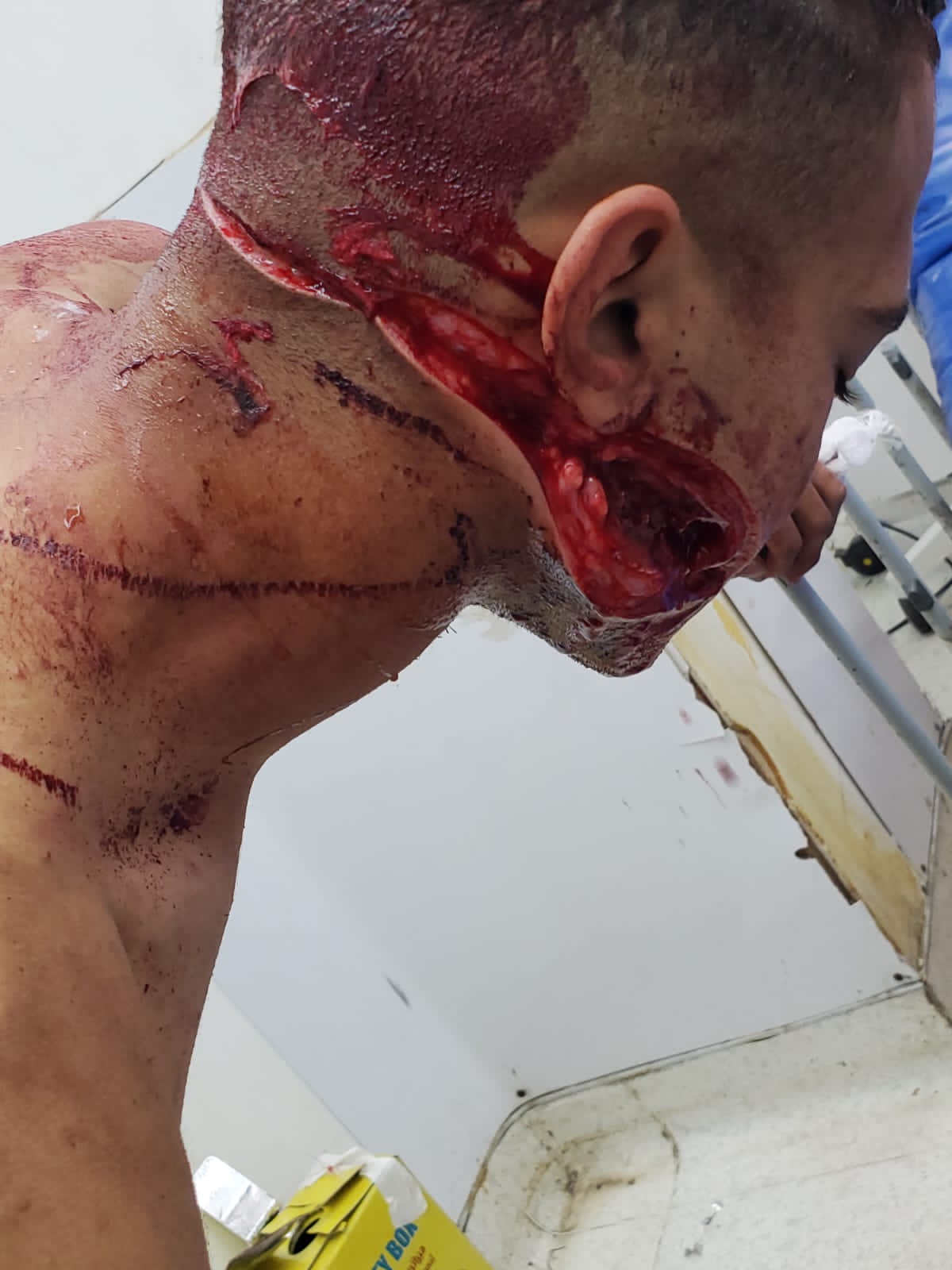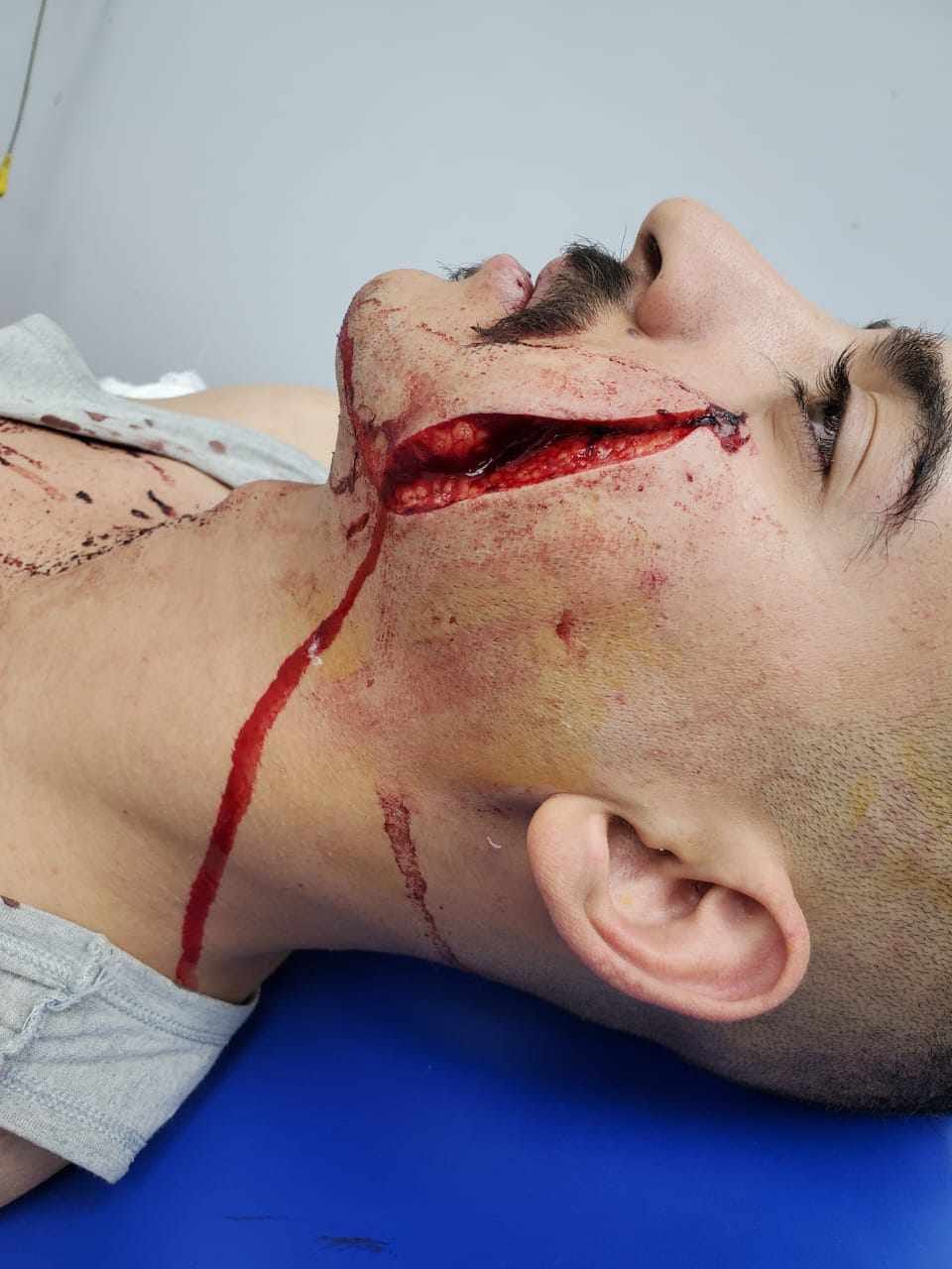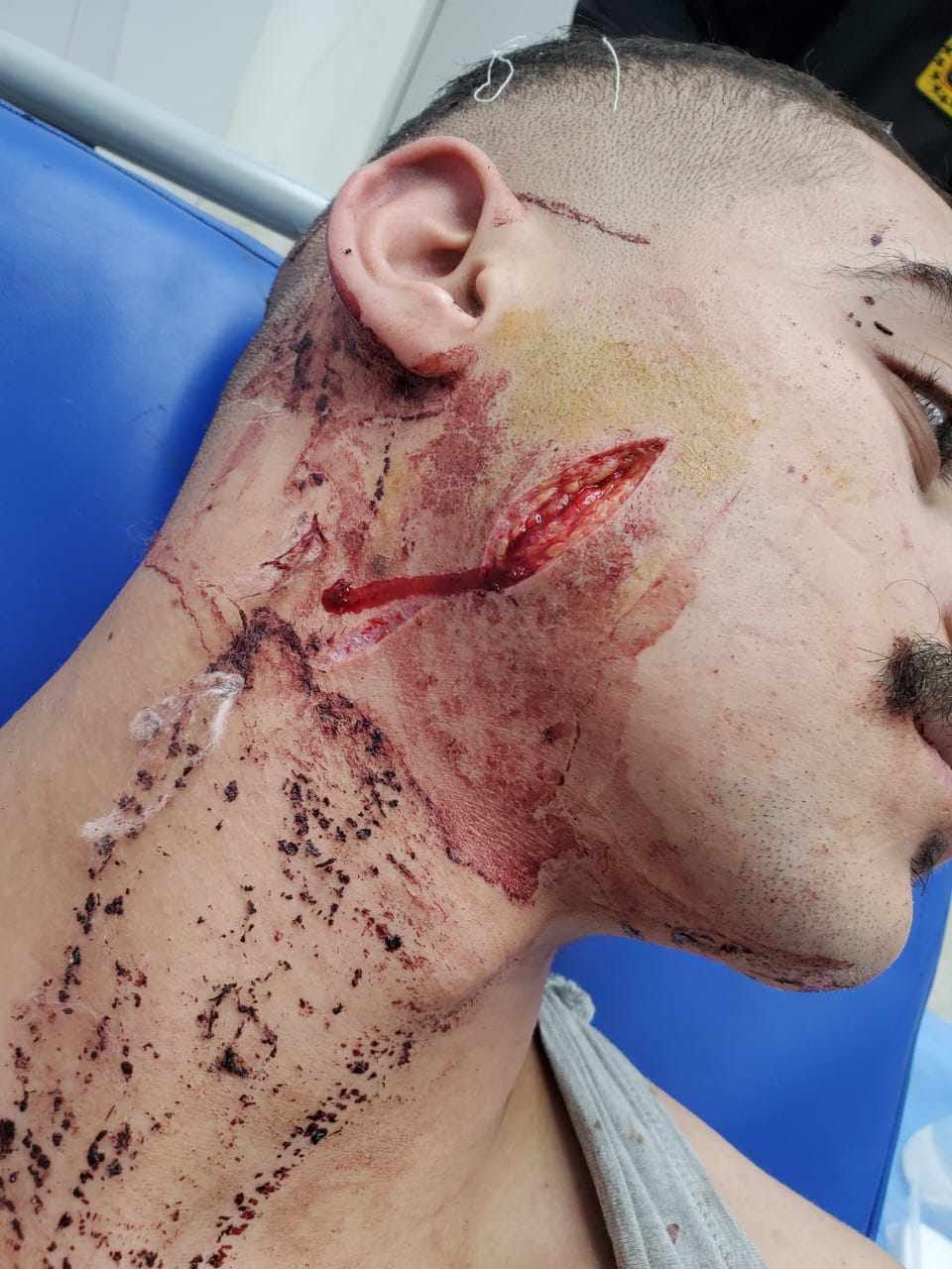 وبالكشف الطبي الذي أجراه الدكتور محمد ياسر، أخصائي جراحة الوجه والفكين، على (ا.م. م)، تبين وجود إصابات متعددة، جرح قطعي في الخد الأيمن وجرح في الرقبة وجرح في فروة الرأس وجرح بالخد الأيسر والغدة النكافية، وتم إصلاح الغدة خياطة الجروح تحت تأثير المخدر الموضعى ويحتاج علاج أكثر من واحد وعشرون يوم ويوجد جروح متعددة بالظهر والزراع الأيسر، وتم خياطة الجروح تحت تأثير المخدر الموضعى وخروج ومتابعة بالعيادة الخارجية.