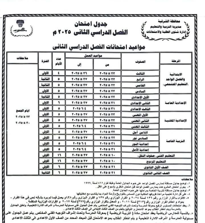 محافظ الشرقية يعتمد جدول امتحانات الفصل الدراسي الثاني 2025