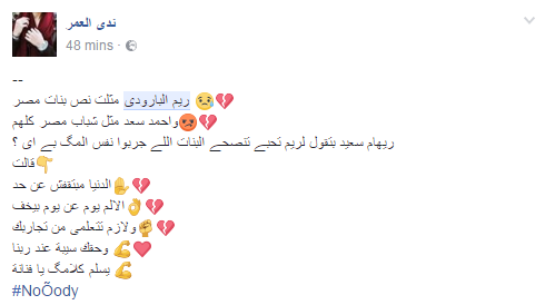 وعلقت إحدى الفتيات على هذه الواقعة قائلة: " ريم البارودى مثلت نص بنات مصر وأحمد سعد مثل شباب مصر كلهم"، فيما كتبت أخرى قائلة: "أحمد سعد ده كان مطربى المفضل بعد حواره مع سميه الخشاب ده نزل من نظرى جدا بنى آدم مستهتر وريم ربنا هيعوضها بأحسن منه وأنضف منه إن شاء الله وهيسيب سمية برده أصل اللى زيه كده ملهوش أمان أعوذ بالله".