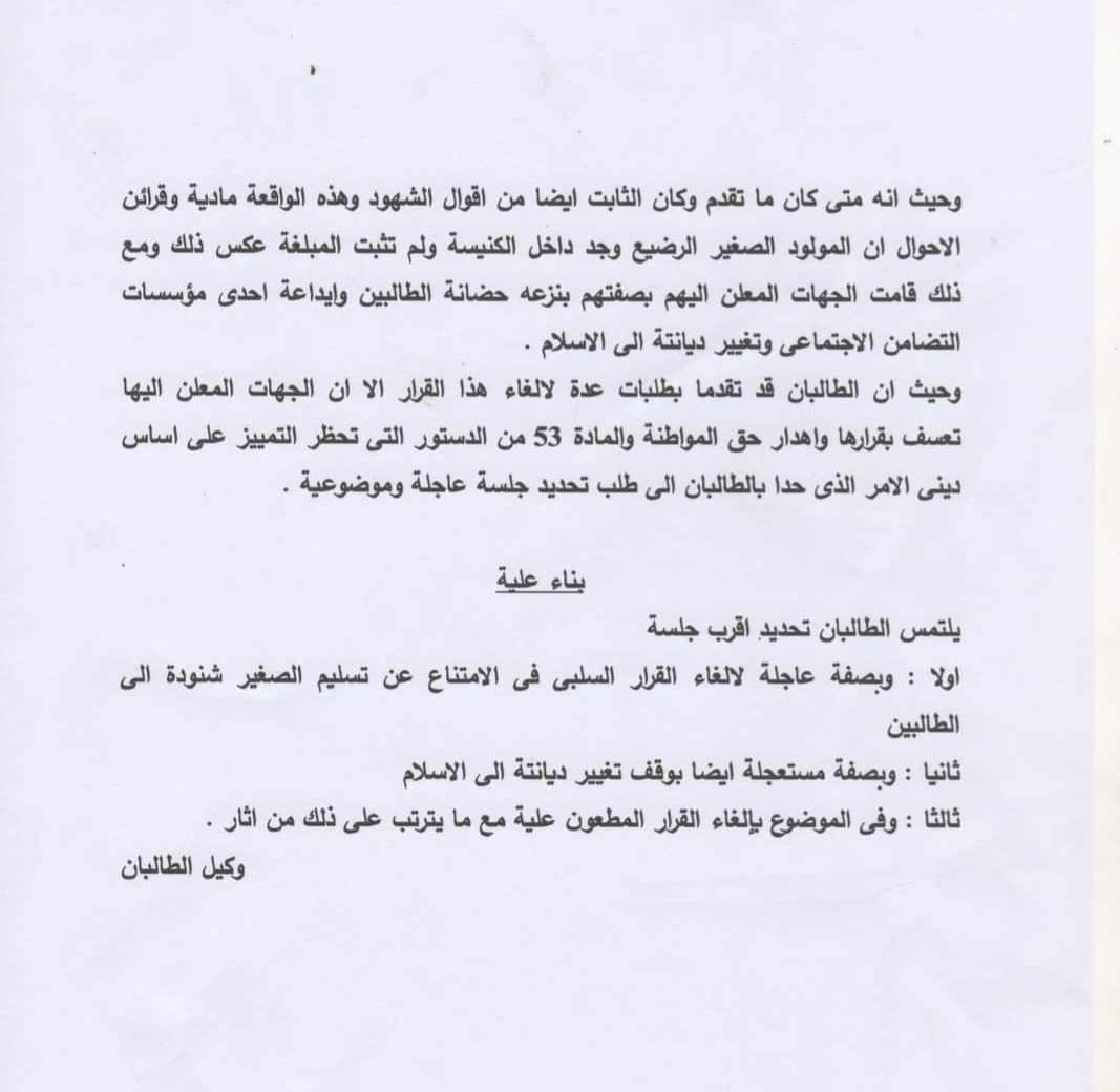 لافتا إلى أن المسيحيين يخضعون لقواعد الميراث والذكر مثل حظ الأنثيين رغم وجود المادة الثالثة في الدستور التي تنص على أن يحتكم المسيحيون واليهود إلى شرائعهم الخاصة في أحوالهم الشخصية، إذ أن المشرع حتى الآن لم يصدر قانونًا بالمساواة في الميراث لدى المسيحيين فللذكر مثل حظ الأنثيين.والتمس المحامي في دعواه تحديد أقرب جلسة وبصفة عاجلة لإلغاء القرار السلبي في الامتناع عن تسليم الصغير شنودة للزوجين، وطالب بصفة مستعجلة بوقف تغيير ديانته إلى الإسلام، وفي الموضوع بإلغاء القرار المطعون عليه مع ما يترتب على ذلك من آثار.