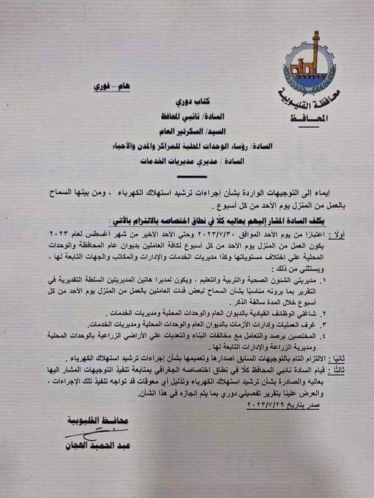 أولا: إعتبارا من يوم الأحد الموافق 2023/7/30وحتى الأحد الأخير من أغسطس لعام 2023، يكون العمل من المنزل يوم الأحد من كل أسبوع لكافة العاملين بديوان عام المحافظة والوحدات المحلية على إختلاف مستوياتها وكذلك مديريات الخدمات والادارات والمكاتب والجهات التابعة لها.