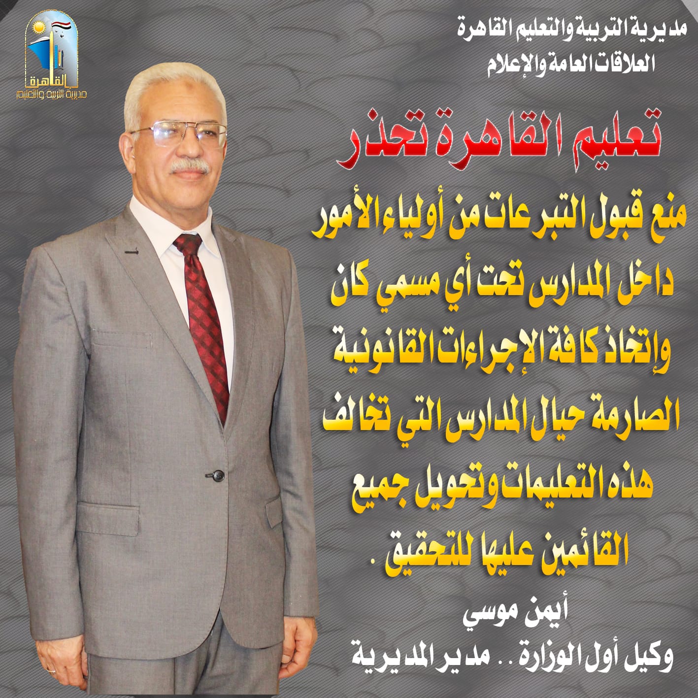 وأصدر أيمن موسى، وكيل أول الوزارة، ومدير مديرية التربية والتعليم بالقاهرة، تعليمات مشددة لجميع الإدارات التعليمية، بمنع قبول أى تبرعات من أولياء الأمور داخل المدارس تحت أى مسمى.