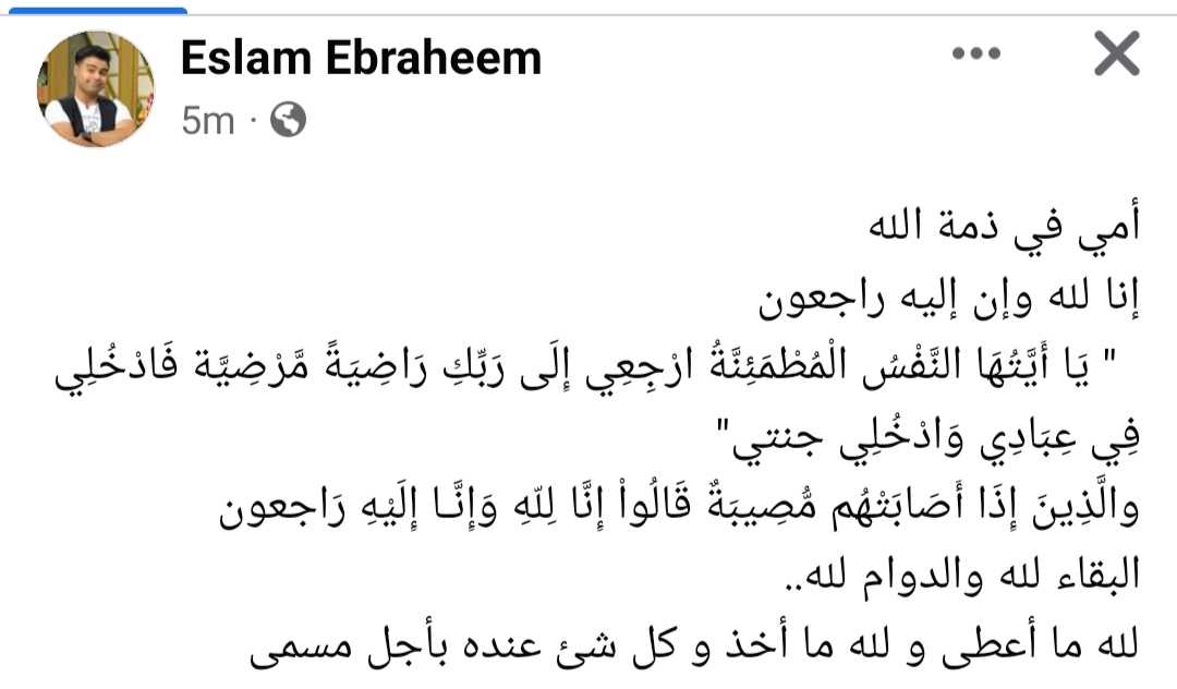 وكتب: «أمي في ذمة الله.. إنا لله وإن إليه راجعون.. يا أَيَّتُهَا النَّفْسُ الْمُطْمَئِنَّةُ ارْجِعِي إِلَى رَبِّكِ رَاضِيَةً مَّرْضِيَّة فَادْخُلِي فِي عِبَادِي وَادْخُلِي جنتي».