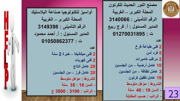 وأوضحت وزارة العمل، أن المحافظات التي تتوفر فيها الفرص هي: «القاهرة، والجيزة، والشرقية، وبورسعيد، والأسكندرية، والفيوم، وأسيوط، وأسوان، وقنا، وسوهاج، وشمال سيناء، والإسماعيلية»، وأما عن أبرز التخصصات المطلوبة فهي كالتلي: