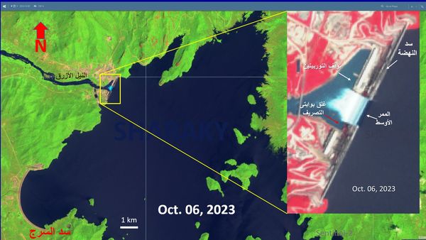 وأضاف: تُظهر الصور الفضائية اليوم 6 أكتوبر 2023 بعد مرور 28 يومًا على انتهاء التخزين الرابع وفتح بوابات سد الروصيرص لتتدفق المياه نحو سد مروى، الذي يصرف المياه لتصل السد العالي مع منتصف الشهر الجاري.