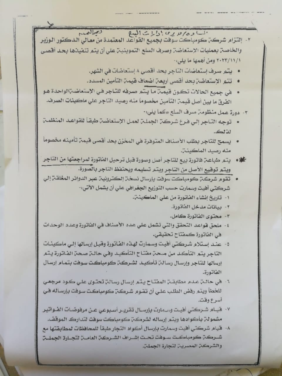 أولًا: إلتزام شركة كومباكت سوفت بجميع القواعد المعتمدة من وزير التموين والخاصة بعمليات الاستعاضة وصرف السلع التموينية على أن يتم تنفيذها بحد أقصى 2023/11/1 ومن أهمها ما يلى:-