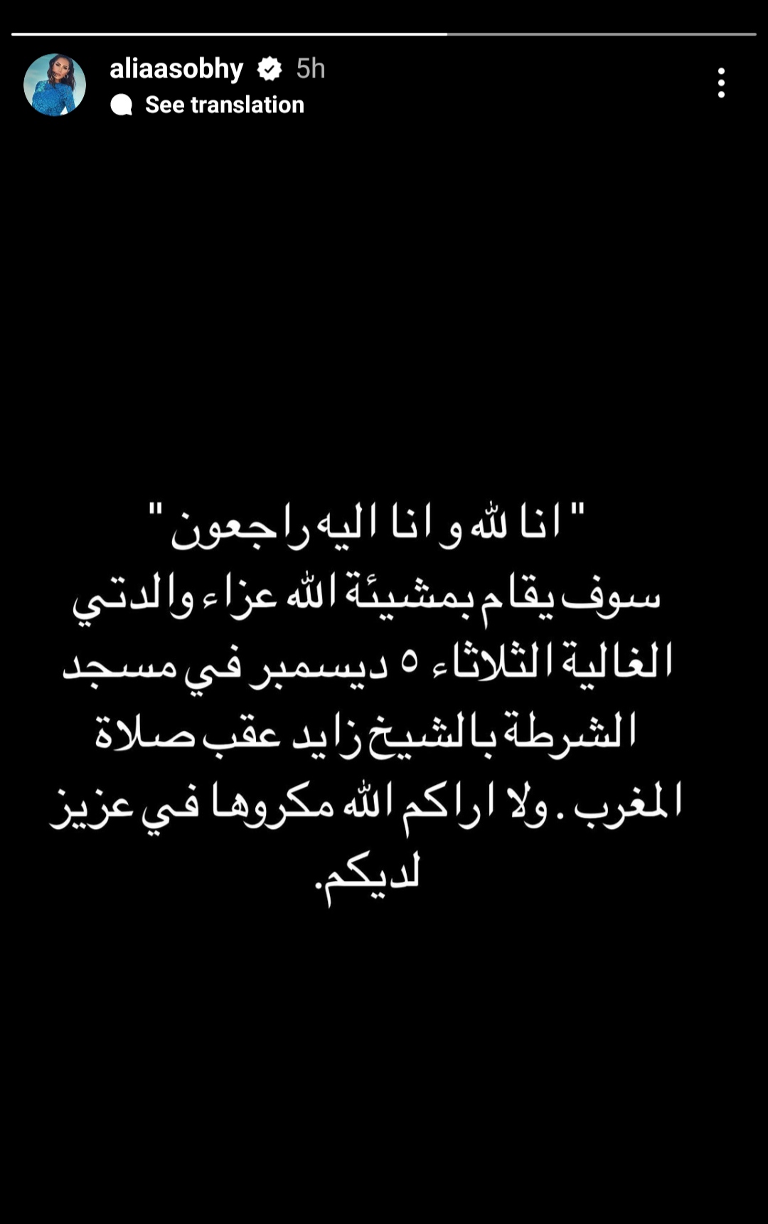 وكتبت، عبر خاصية «الإستوري» على موقع الصور الشهير «إنستجرام»: «إنا لله وإنا إليه راجعون سوف يقام بمشيئة الله عزاء والدتي الغالية الثلاثاء 5 ديسمبر في مسجد الشرطة، بالشيخ زايد، ولا أراكم الله مكروه في عزيز لديكم».