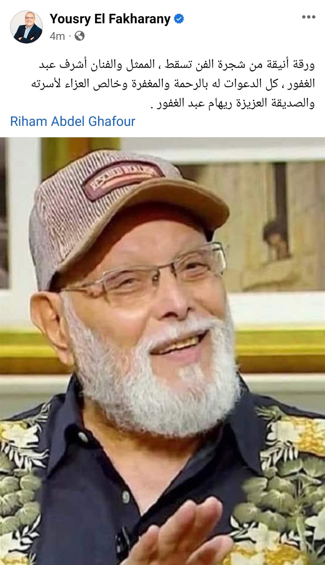 وكتب، عبر حسابه على موقع التواصل الاجتماعي «فيس بوك»: «ورقة أنيقة من شجرة الفن تسقط، الممثل والفنان أشرف عبد الغفور، كل الدعوات له بالرحمة والمغفرة وخالص العزاء لأسرته والصديقة العزيزة ريهام عبد الغفور».