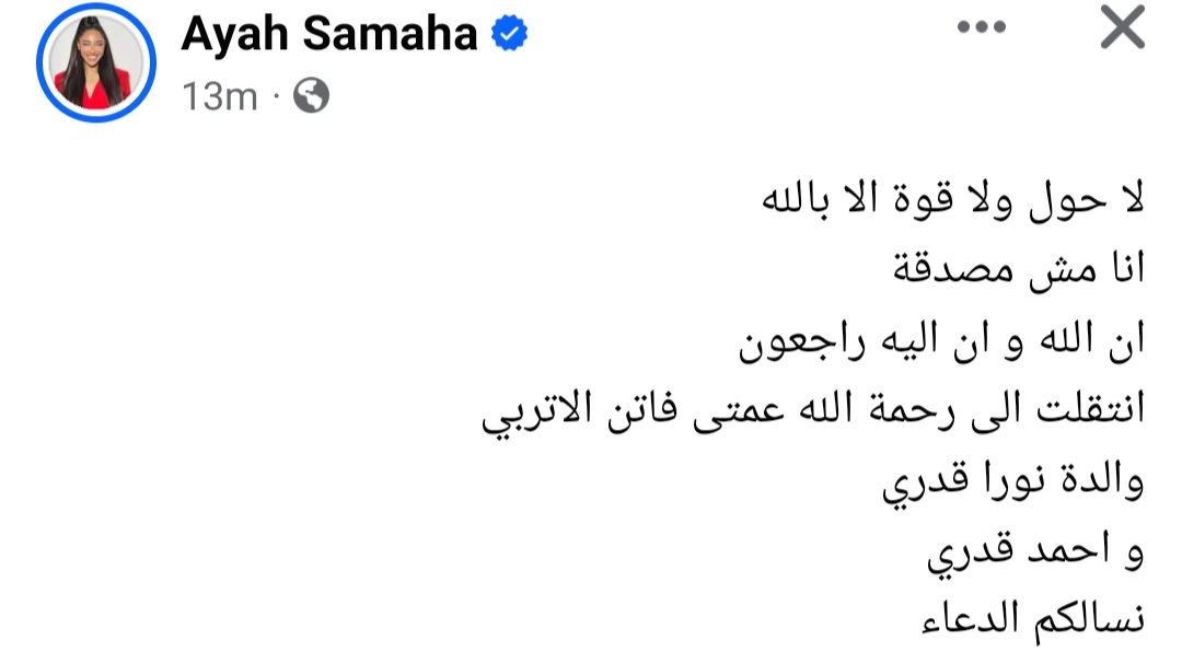 وكتبت: «لا حول ولا قوة إلا بالله.. أنا مش مصدقة.. إن لله وإن إليه راجعون.. انتقلت إلى رحمة الله تعالى عمتي فاتن الأتربي.. والدة نورا قدري وأحمد قدري.. نسألكم الدعاء».