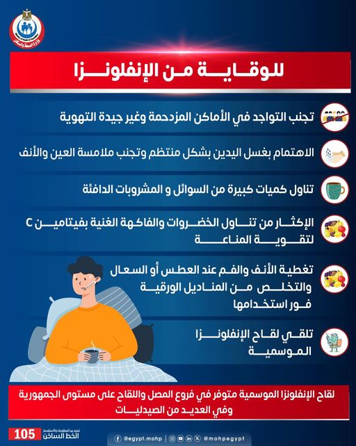 أوضحت وزارة الصحة والسكان، طرق الوقاية من الإصابة بالإنفلونزا، مؤكدة أن لقاح الإنفلونزا الموسمية متوفر في فروع المصل واللقاح على مستوى الجمهورية وفي العديد من الصيدليات.