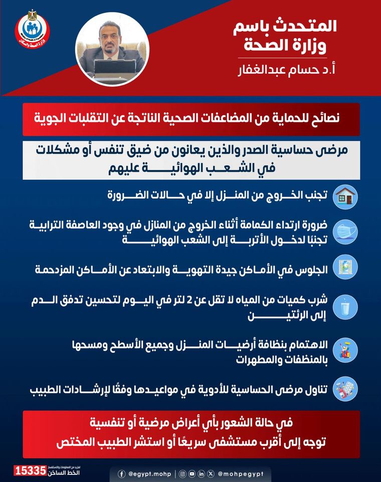 وجاءت نصائح «عبدالغفار» للحماية من المضاعفات الصحية الناتجة عن التقلبات الجوية، كالآتي: