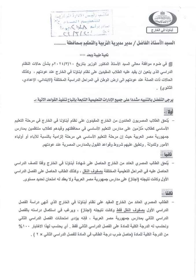 أصدرت وزارة التربية والتعليم والتعليم الفني، تعليمات عاجلة لمديري مديريات التربية والتعليم والتعليم الفني، بضرورة اتباع القواعد الآتية بشأن قيد الطلاب المقيدين على نظام أبنائنا في الخارج عند عودتهم لاستكمال الدراسة في مصر في المراحل الدراسية المختلفة (الابتدائي- الإعدادي- الثانوي):