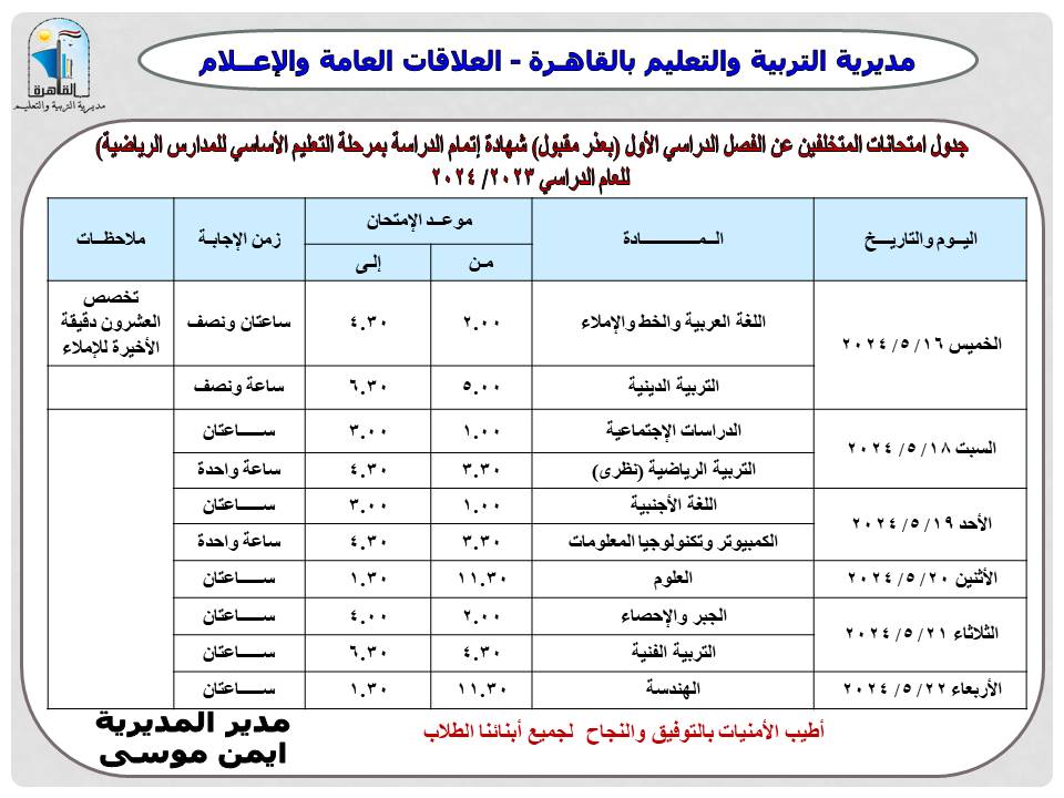 وأشار " أيمن موسى "وكيل أول الوزارة ومدير مديرية التربية والتعليم بالقاهرة إلى أن طلبة وطالبات الصف الرابع والخامس الابتدائي وما يعادله سيؤدون الامتحانات في الفترة من الأربعاء ٨ مايو حتى الاثنين ١٣ مايو.