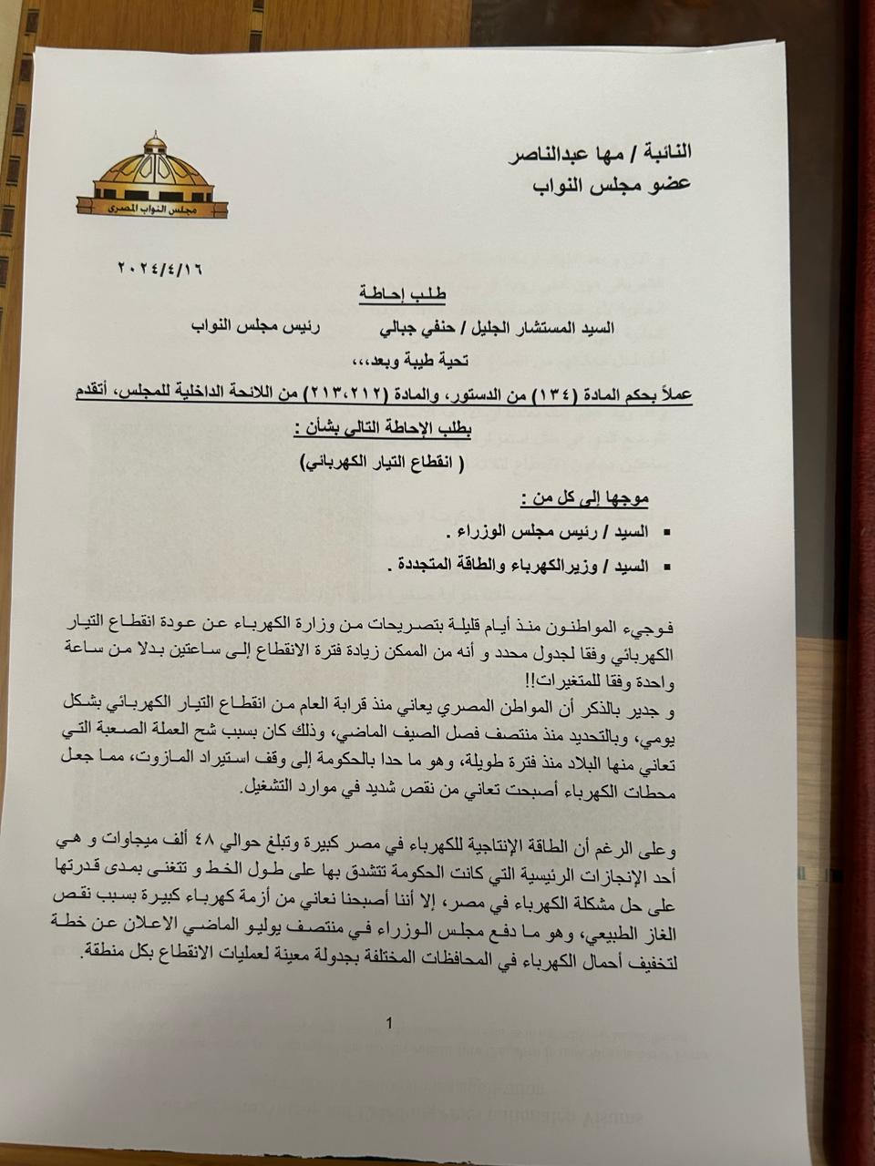 تقدمت الدكتورة مها عبد الناصر، عضو مجلس النواب ونائب رئيس الحزب المصري الديمقراطي الاجتماعي بطلب إحاطة بشأن (انقطاع التيار الكهربائي).