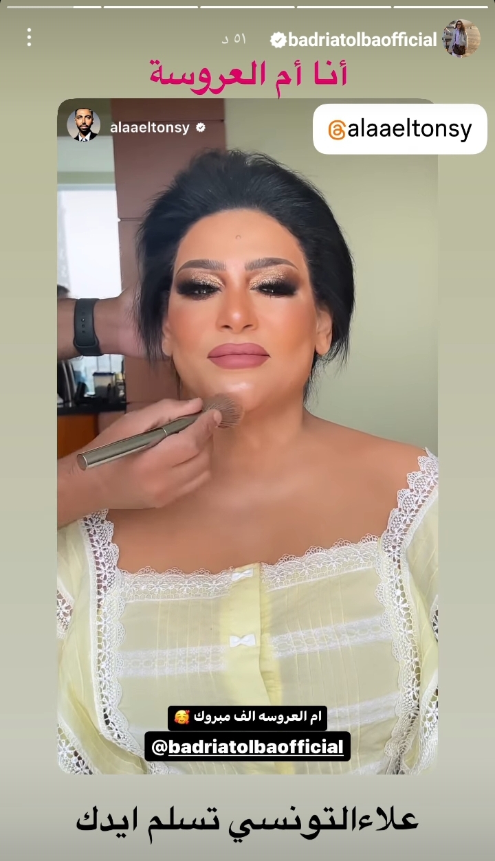 وشاركت بدرية طلبة جمهورها ومتابعيها، بمقطع فيديو لها خلال استعداداتها لحفل زفاف ابنتها سلمى، وذلك عبر خاصية استوري حسابها الشخصي بموقع تبادل الصور والفيديوهات الشهير، وعلقت قائلة: “أنا أم العروسة”.