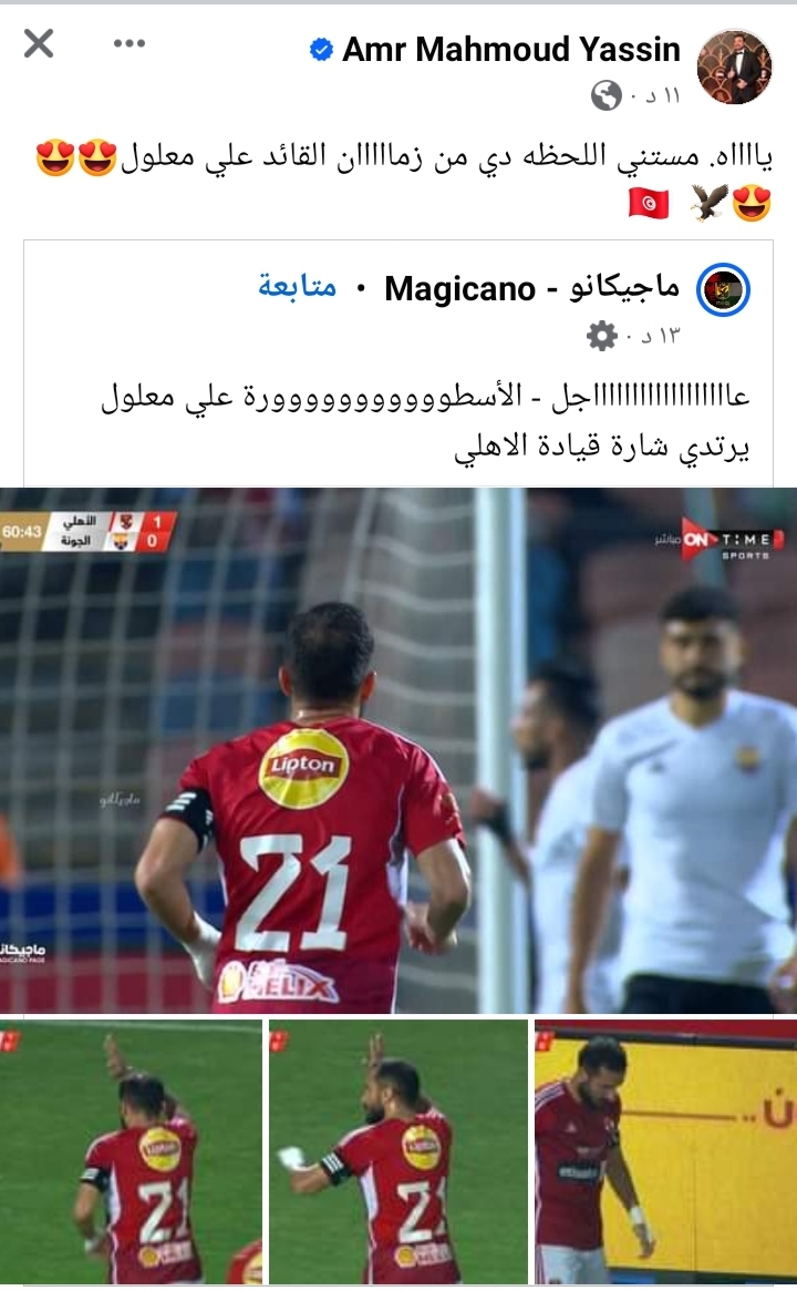 وعلق المؤلف عمرو محمود ياسين، على إرتداء علي معلول شارة قيادة الأهلي في المباراة التي تقام اليوم، عبر حسابه الشخصي بموقع التواصل الاجتماعي فيسبوك.