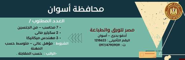 أعلنت وزارة العمل توفير نحو 27 فرصة عمل في محافظة أسوان، وبرواتب مجزية، فضلًا عن التأمين الطبي والاجتماعي، وذلك بالتنسيق مع عدد من شركات القطاع الخاص، إذ تتضمن محاسبين وسكرتارية، ومهندسين وعمال لمختلف الأعمار.
