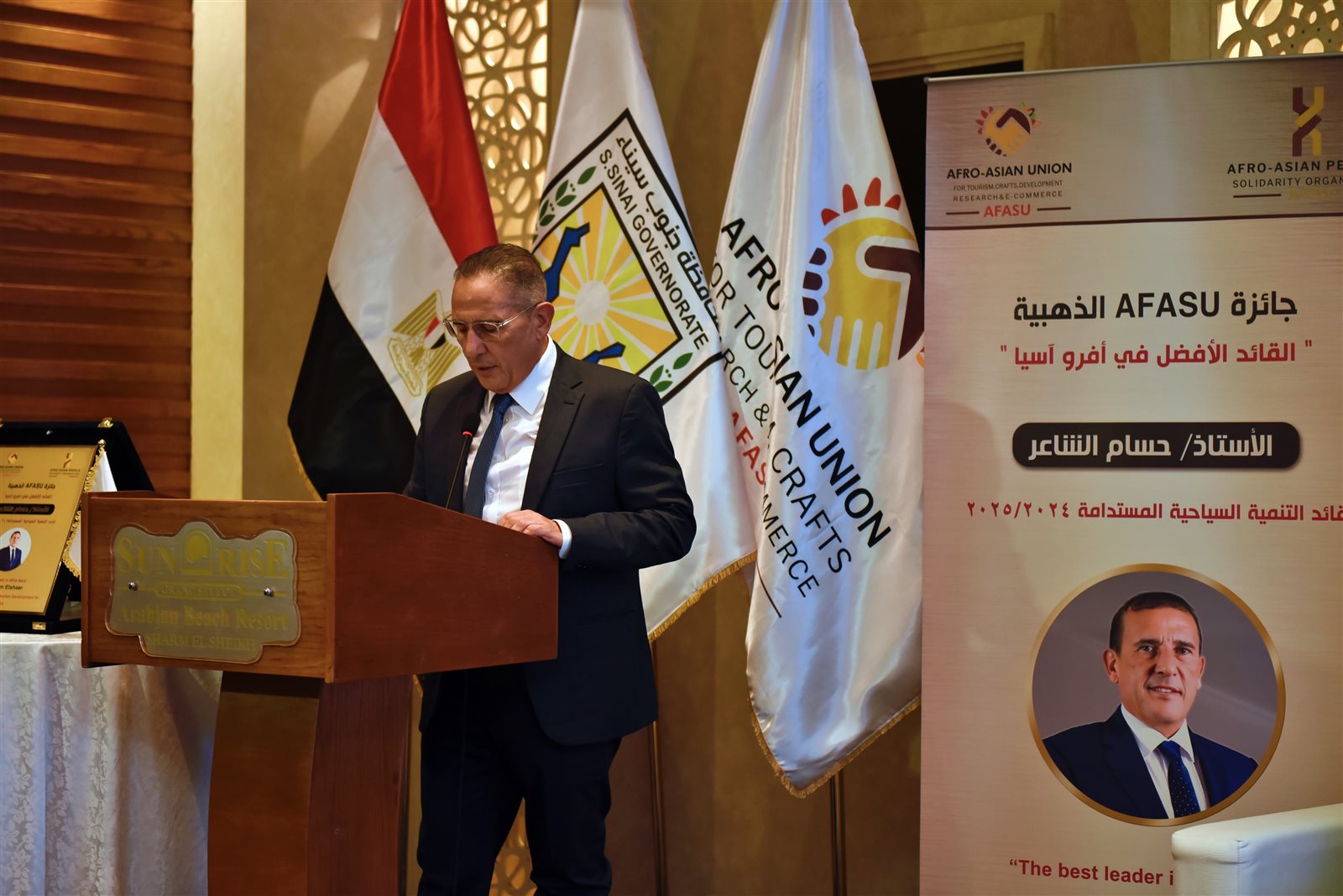 من جانبه وجه الخبير السياحي ورجل الاعمال حسام الشاعر عضو الاتحاد المصري للغرف السياحية ورئيس مجلس ادارة مجموعة صن رايز الفندقية التحية لمحافظ جنوب سيناء والاتحاد الأفريقي الأسيوي لفوزه بتلك الجائزة الرفيعة معربا عن سعادته لتكريمه وفوزه بجائزة الإتحاد الإفريقي الآسيوي AFASU "جائزة الأفضل في أفرو آسيا من بين 102 دولة، كقائد التنمية السياحية المستدامة 2024/2025.