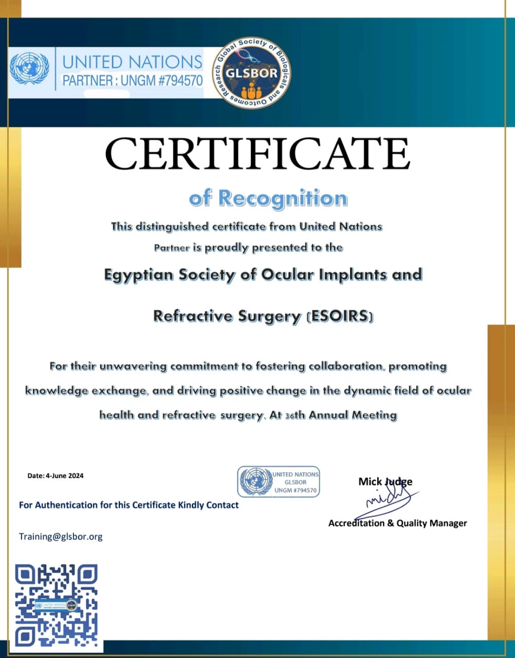 وعبر رئيس الجمعية المصرية لزرع العدسات، عن سعادته بمنح مؤسسة جلسبور الشريك العلمي لمنظمة الأمم المتحدة لشهادة تقدير للمؤتمر، لان هذا يعكس حجم العمل والإنجاز الذي تم خلال المؤتمر والمستوي العلمي والحضور الذي تجاوز 1000 طبيب وتابع قائلًا: وهذا يحملنا مسئولية كبيرة لنتميز ونقدم العام المقبل أفضل ما لدينا.