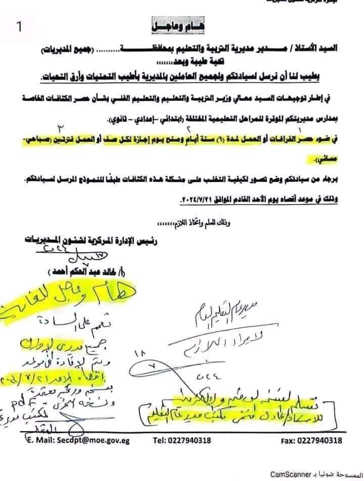 وتركت الوزارة لكل مديرية الاختيار من الخيارات المطروحة، لتنفيذها وإبلاغ الوزارة بها قبل 21 يوليو الجارى.
