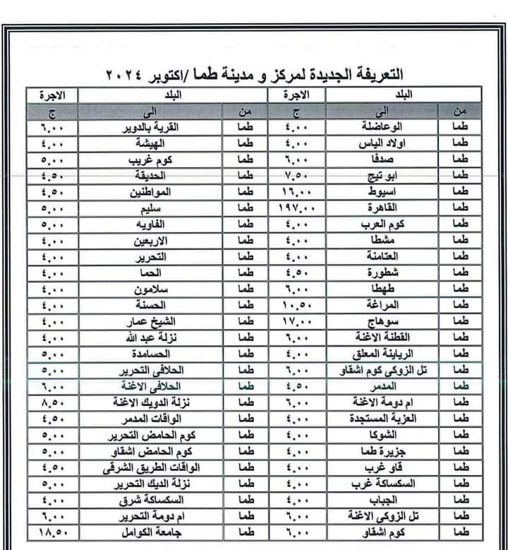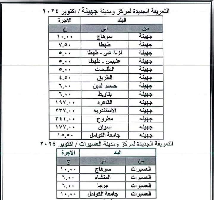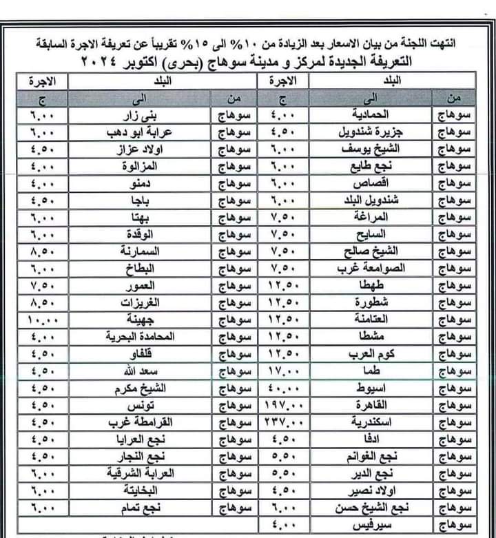 تعريفة الركوب الجديدة المقررة بمراكز سوهاج بعد تحريك أسعار الوقود