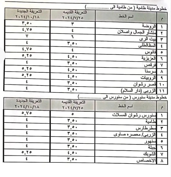 أعلنت محافظة الفيوم تعريفة الركوب الجديدة لخطوط سير السرفيس والتاكسي وسيارات الأجرة العاملة على الخطوط الداخلية والخارجية بين مراكز المحافظة، والمحافظات الأخرى، وذلك بعد إعلان لجنة التسعير التلقائي للمنتجات البترولية، تحريك أسعار البنزين والسولار، بدءًا من صباح اليوم الجمعة 18 اكتوبر.