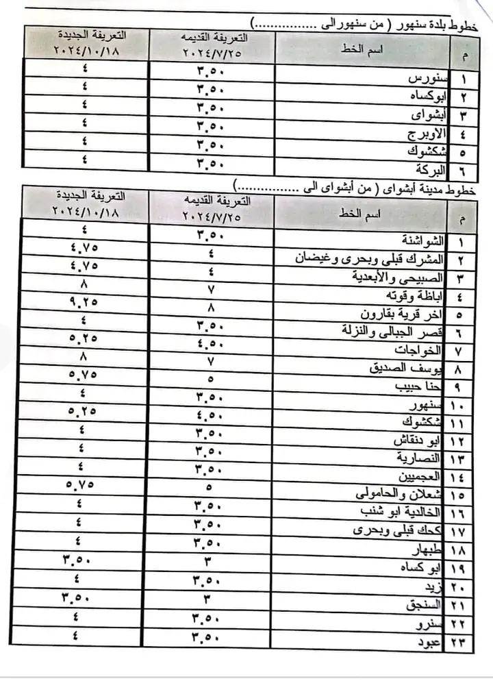 ووجه محافظ الفيوم، مدير عام المواقف، بالإعلان عن التعريفة الجديدة في مكان واضح بجميع مواقف السيارات بدائرة المحافظة، من خلال وضع لافتة مبين بها خطوط السير وقيمة الأجرة المقررة لكل خط، وكذا وضع استيكرات موضح به تعريفة الركوب وخط السير وعدد الركاب يتم لصقها على الزجاج الأمامي والخلفي لسيارات الأجرة والسرفيس، لتعريف المواطنين بتعريفة الركوب الرسمية، وتطبيق القانون بكل حزم على المخالفين.