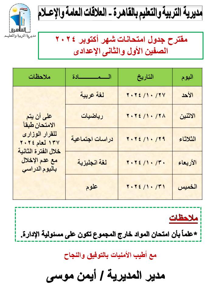 أكدت مديرية التربية والتعليم بالقاهرة انطلاق امتحانات شهر أكتوبر لجميع صفوف النقل على مستوى المراحل التعليمية الثلاثة ابتدائى واعدادى وثانوى، يوم الاحد الموافق 2024/10/27 حتي يوم الخميس 2024/10/31.