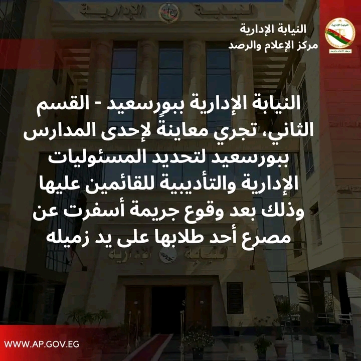 وأشار المستشار سمير إلى أن مركز الإعلام والرصد بالنيابة الإدارية قد أبلغ النيابة الإدارية ببورسعيد القسم الثاني، حيال ما تم رصده على عددٍ من المواقع الإخبارية بشأن حادث مقتل أحد الطلبة بالمدرسة على يد زميل له داخل مقر المدرسة خلال ساعات اليوم الدراسي صباح الأحد الماضي؛ وذلك لسرعة مباشرة التحقيقات وتحديد المسئوليات التأديبية والإدارية للقائمين على المدرسة من المدرسين والمشرفين خلال هذا اليوم.