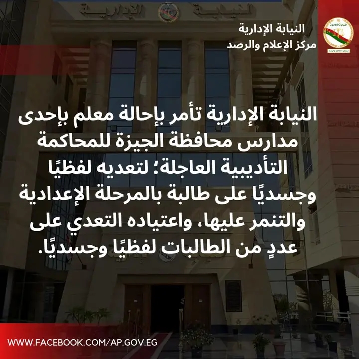 أكد المستشار محمد سمير، المتحدث الرسمي باسم النيابة الإدارية، أنه تم إحالة معلم بإحدى مدارس محافظة الجيزة للمحاكمة التأديبية العاجلة؛ لتعديه لفظيًا وجسديًا على طالبة بالمرحلة الإعدادية والتنمر عليها، واعتياده التعدي على عددٍ من الطالبات لفظيًا وجسديًا.