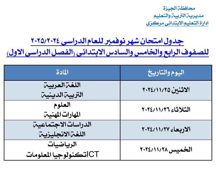 جداول ومواصفات امتحانات شهر نوفمبر لصفوف النقل الابتدائي والإعدادي والثانوي بمحافظة الجيزة