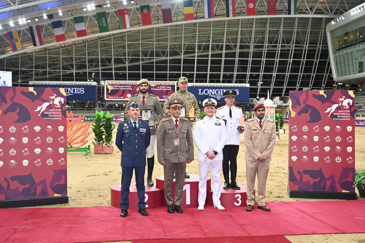 وقام العميد راشد الدوسري - نائب رئيس الإتحاد الرياضي العسكرى القطرى، والعقيد روبرتو فورديجو ممثل المجلس الدولى للرياضة العسكرية ( السيزم ) بتسليم الجوائز للفرسان الثلاثة الأوائل.