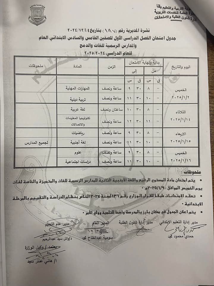 وتبدأ امتحانات الصفين الخامس والسادس بالمرحلة الابتدائية العام والرسمي لغات والدمج يوم الخميس الموافق 2/1/2025م وتستمر حتى الخميس 16/1/2025م