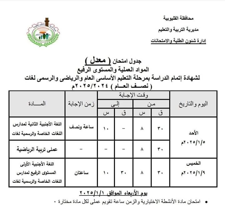 ونشرت محافظة القليوبية، جداول امتحانات منتصف العام الدراسي الشهادة الاعدادية(بعد التعديل) وصفوف النقل الاعدادي( بعد التعديل).