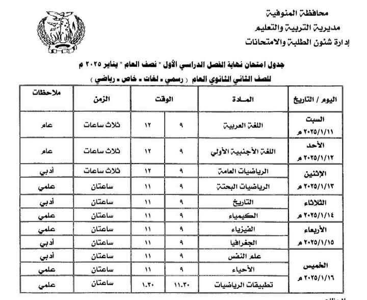 ننشر جداول امتحانات نصف العام لصفوف النقل والشهادة الإعدادية بالمنوفية
