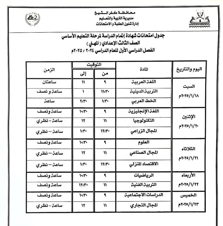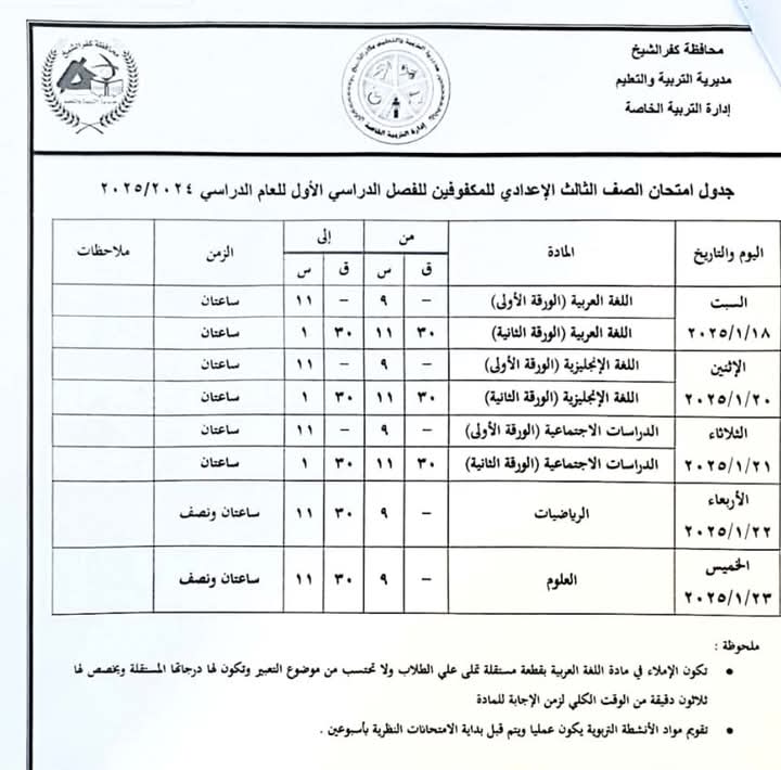 جداول امتحانات نصف العام لصفوف النقل والشهادة الإعدادية بكفر الشيخ