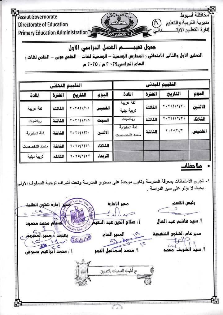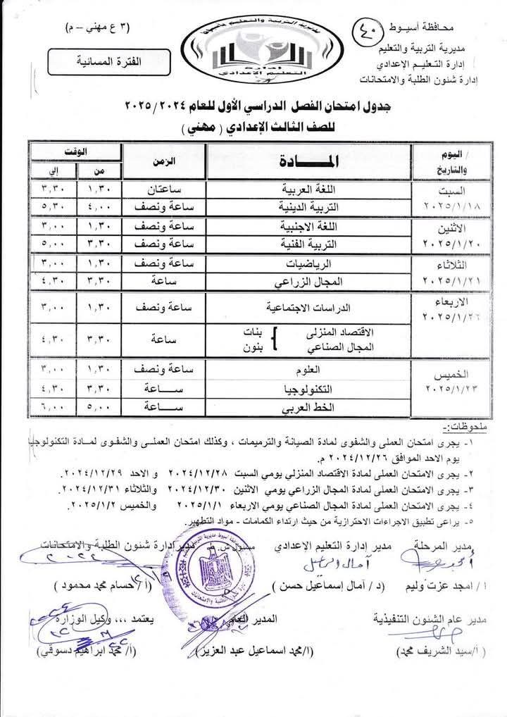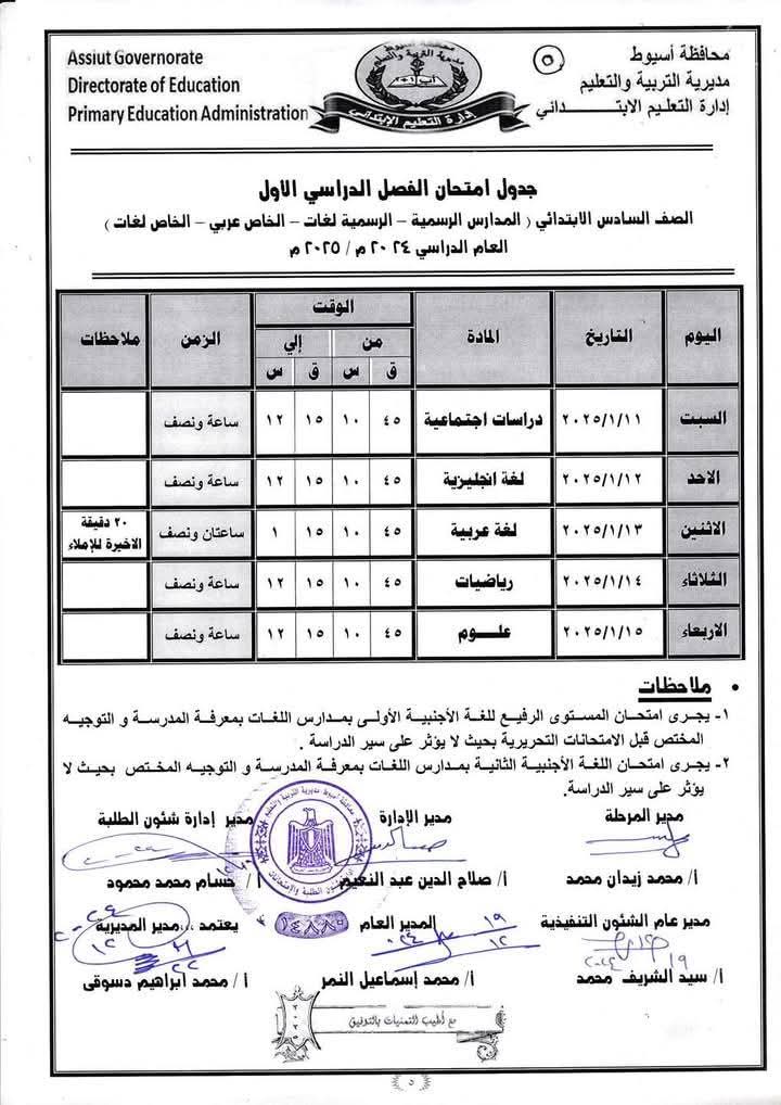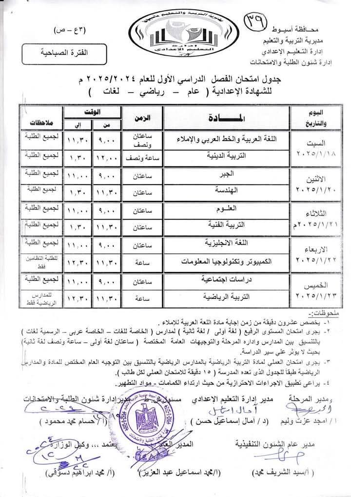 جداول امتحانات نصف العام لصفوف النقل بالمرحلة الابتدائية والإعدادية والشهادة الإعدادية بأسيوط