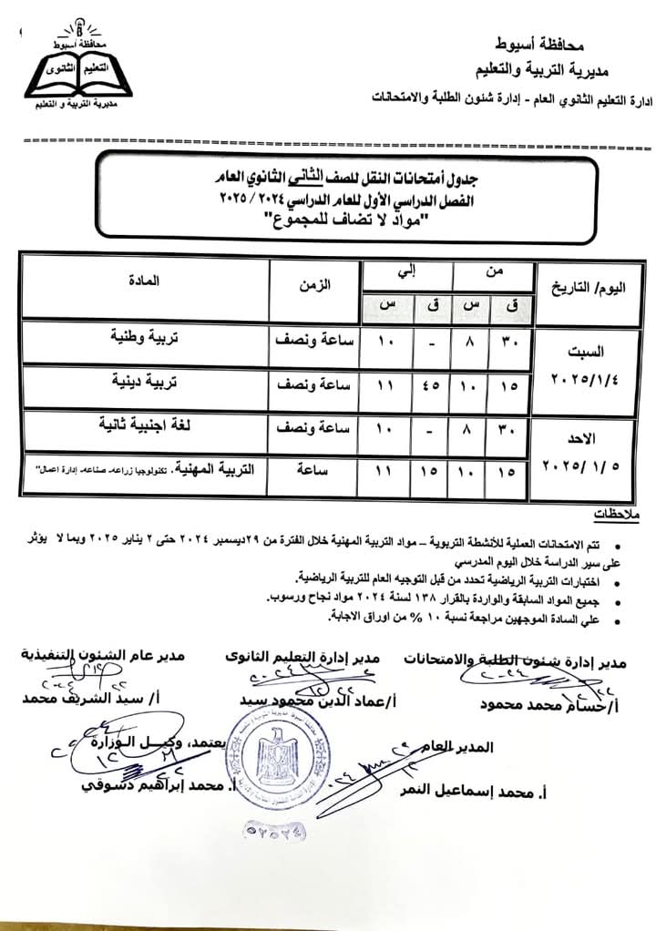 أعلنت مديرية التربية والتعليم بأسيوط، جداول امتحانات الفصل الدراسي الأول للصفين الأول والثاني الثانوي العام للعام الدراسي ٢٠٢٤ / ٢٠٢٥.