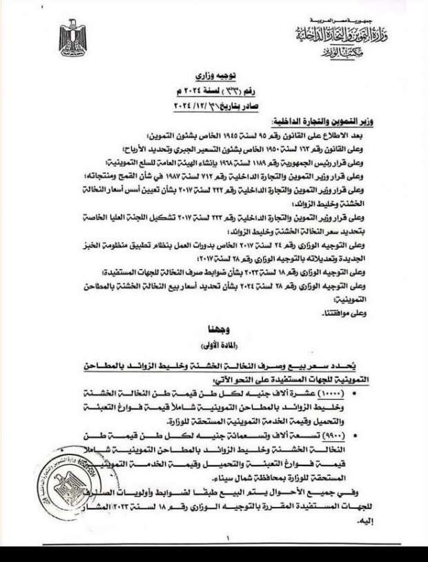 - 10 آلاف جنيه سعر طن النخالة الخشنة وخليط الزوائد في جميع المحافظات، شاملا تكاليف التعبئة والتحميل والخدمات التموينية المستحقة.