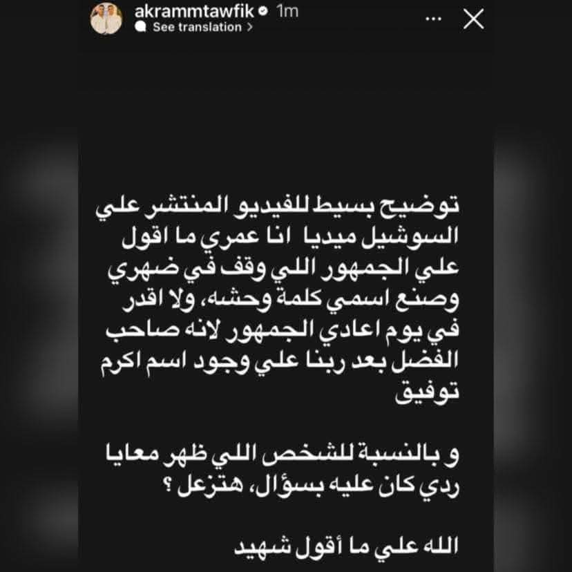 أكرم توفيق يرد من خلال إنستجرام بعد توريطه فى مقطع فيديو يهاجم جماهير الأهلي