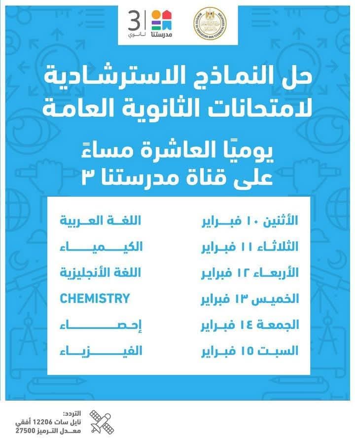 كما أزاحت الوزارة النقاب عن حل النماذج الاسترشادية عبر قناة "مدرستنا ٣"، حيث يخصص يوم لكل مادة، وذلك فى تمام الساعة العاشرة مساء يوميا، على أن تكون الإعادة فى تمام الساعة العاشرة صباح اليوم التالي، وذلك عبر تردد القناة على النايل سات 12206 أُفقي معدل ترميز 27500.
