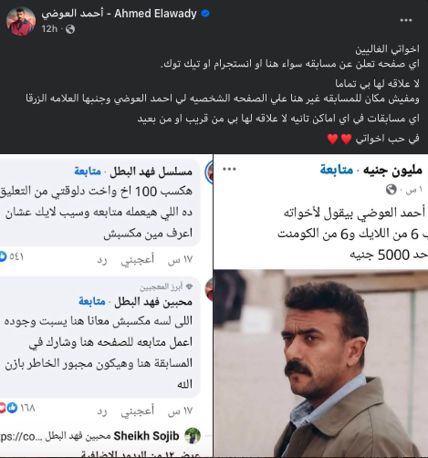 وكتب أحمد العوضي عبر صفحته الرسمية الموثقة على موقع التواصل الاجتماعي فيسبوك: "إخواتي الغاليين، أي صفحة تعلن عن مسابقة سواء هنا أو على إنستجرام أو تيك توك، لا علاقة لها بي تمامًا، ومفيش مكان للمسابقة غير هنا على الصفحة الشخصية لـ أحمد العوضي وجنبها العلامة الزرقاء".