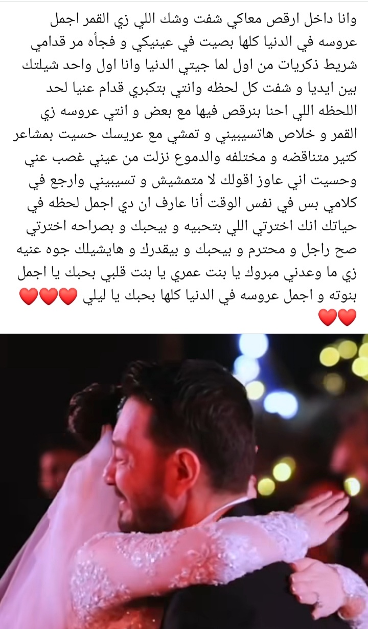 وأختتم أحمد زاهر رسالته قائلا: “مبروك يا بنت عمري يا بنت قلبي بحبك يا اجمل بنوته واجمل عروسه في الدنيا كلها بحبك يا ليلى”.