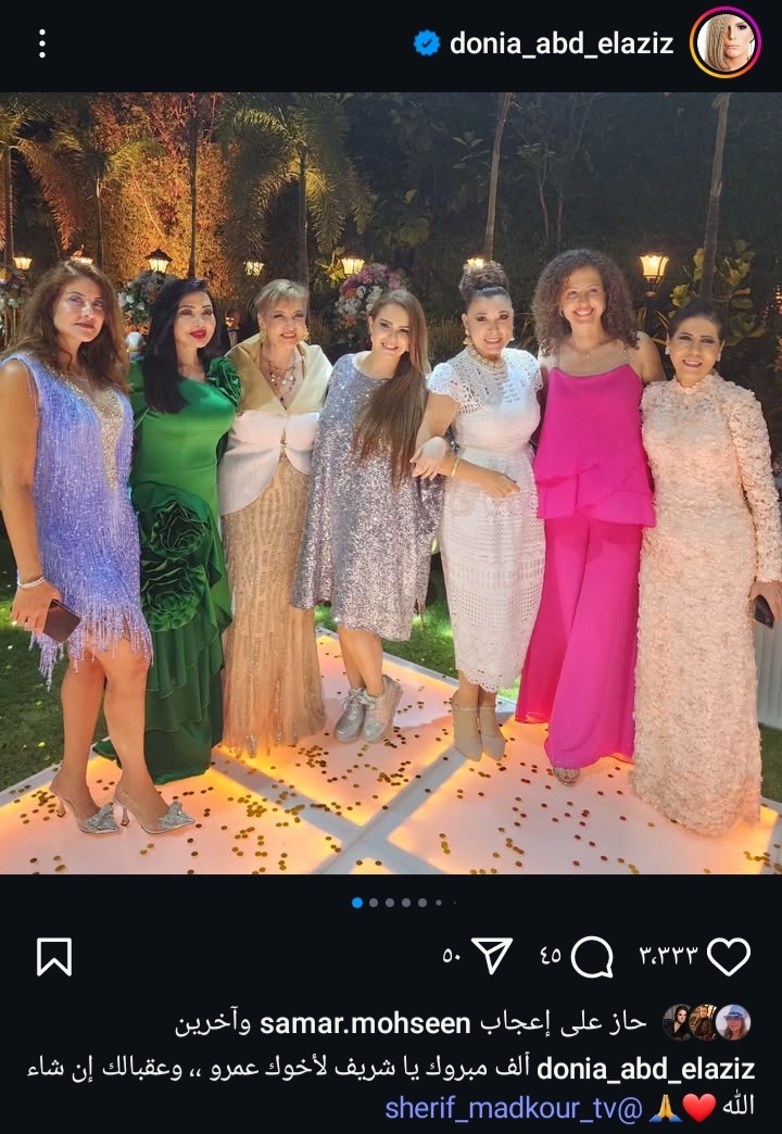 وشاركت دنيا عبد العزيز جمهورها ومتابعيها، بمجموعة صور لها من حفل زفاف شقيق شريف مدكور، وحرصت على تهنئته وذلك عبر حسابها الشخصي بموقع تبادل الصور والفيديوهات الشهير إنستجرام.