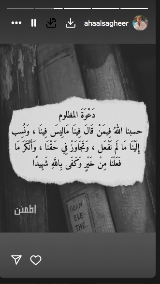 ونشرت مها الصغير دعاء جاء فيه: "دعوة المظلوم.. حسبنا الله فيمن قال فينا ما ليس فينا، ونسب إلينا ما لم نفعل، وتجاوز في حقنا، وأنكر ما فعلنا من خير، وكفى بالله شهيدًا".