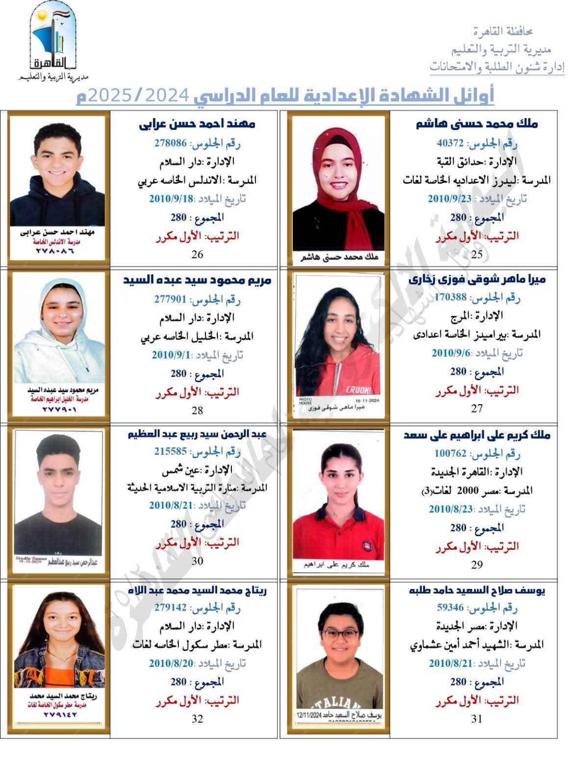 هنّأت مديرية التربية والتعليم بالقاهرة أوائل طلاب الشهادة الإعدادية للعام الدراسي 2024-2025، والذين بلغ عددهم 132 طالبًا وطالبة حصلوا على الدرجة النهائية بإجمالي 280 درجة، في نتيجة امتحانات الفصل الدراسي الثاني.