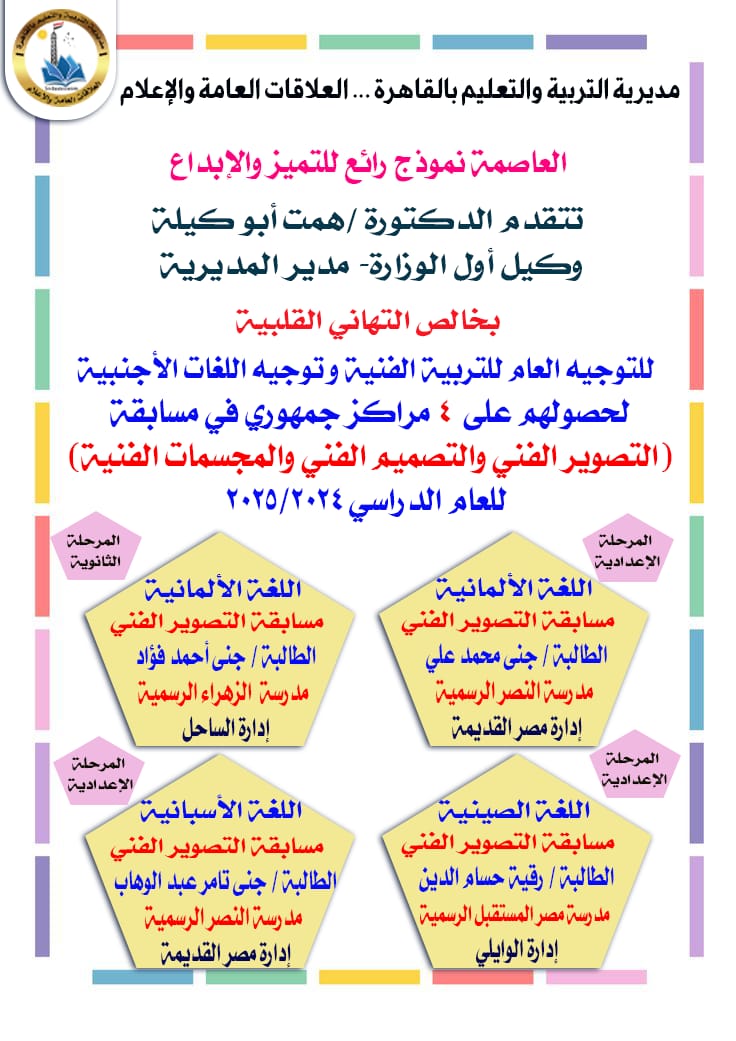حصدت مديرية التربية والتعليم بالقاهرة في تحقيق إنجاز جديد يضاف إلى سجل إنجازاتها، حيث حصد طلابها 4 مراكز على مستوى الجمهورية في مسابقات (التصوير الفني – التصميم الفني – المجسمات الفنية) للعام الدراسي 2024/2025.