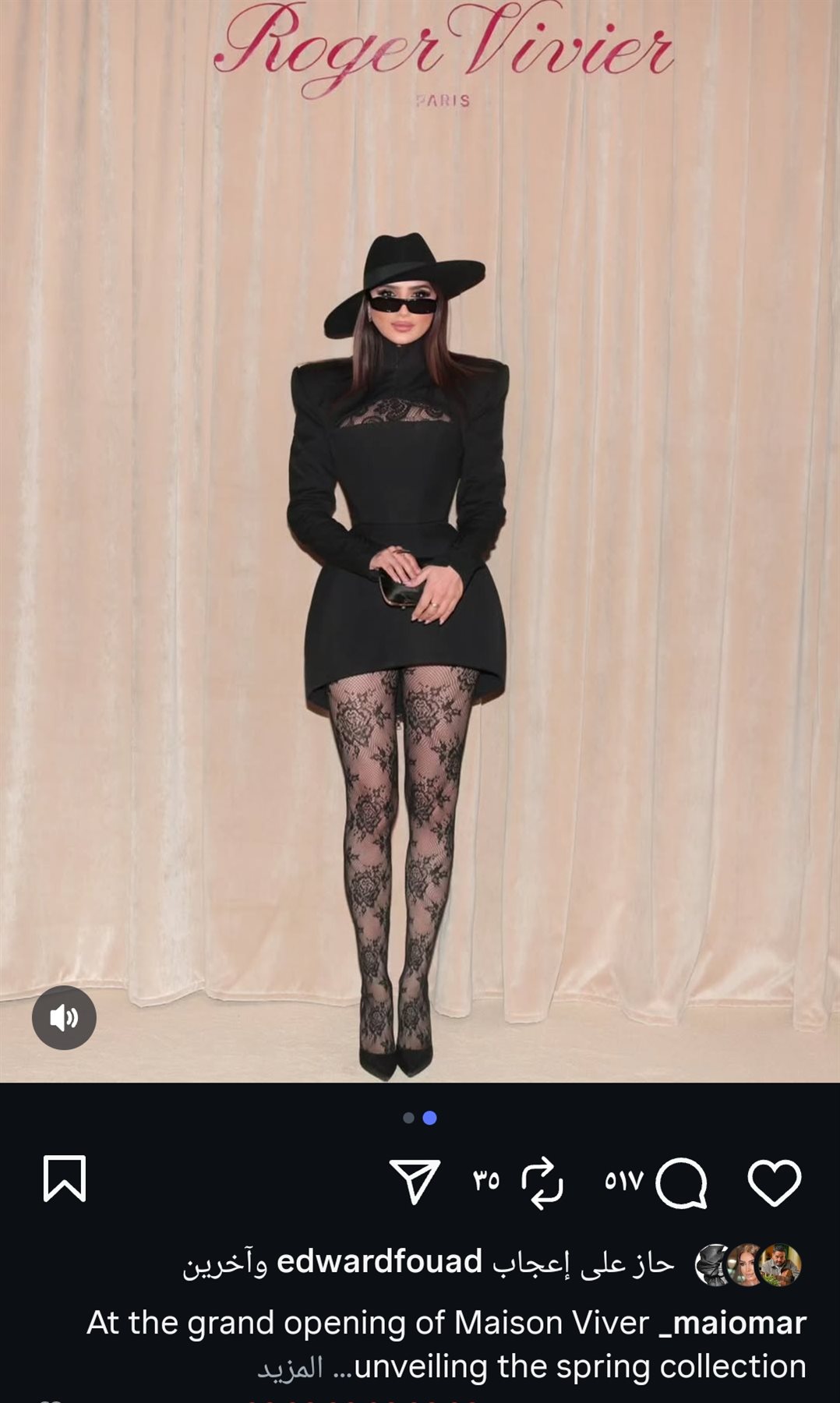خطفَت النجمة مي عمر، الأنظار خلال مشاركتها عرض دار الأحذية والإكسسوارات الفرنسية الشهيرة روجيه فيفييه Roger Vivier، الذي يُقام على هامش أسبوع الموضة في باريس، حيث تألقت بإطلالة أنيقة بطابع ريترو كلاسيكي.