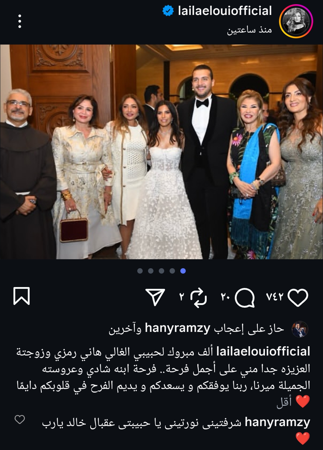 ونشرت ليلى علوي، مجموعة صور من حفل زفاف نجل هاني رمزي، عبر حسابها الشخصي بموقع تبادل الصور والفيديوهات الشهير إنستجرام.